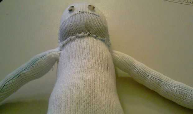 Ahora cose todas las líneas de sólidos, y cortar las líneas punteadas. La cola de la materia y coser en el centro del talón del calcetín de cuerpo/cabeza/piernas. Rellene los brazos y sujete en el correspondiente lado del calcetín de cuerpo/cabeza/piernas. La boca es un poco más complicada, que usted cose en parte en la parte inferior de la cabeza y esas cosas como usted cose, ciérrelo apagado después de relleno hecho. Coser los ojos (o cheat como hice y pegamento caliente en la).