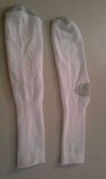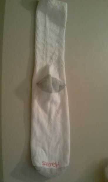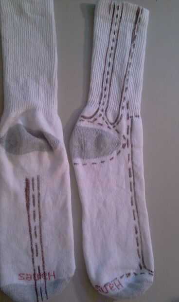 Aplane un calcetín para que el talón se encuentra plano en el centro y coloca el calcetín sin curvar. Se trata de las piernas, cuerpo y cabeza. Marque todas las líneas donde cortar y coser. Desde el dedo del pie dibuja una línea por la mitad a aproximadamente una pulgada por debajo del talón. Utilicé las líneas punteadas para marcar dónde cortar y rayas para marcar donde coser.