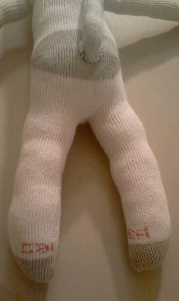 Un calcetín es el patas, el cuerpo y la cabeza. La otra media se divide en brazos, cola, boca, orejas y gorro. Vuelva calcetines.