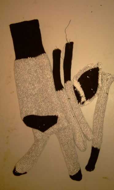 En el otro calcetín parte Tubo acanalado se dividirá en tres partes. Dos de los cuales son los brazos, el último es extra. El talón es la boca. El dedo del pie se puede hacer en un sombrero (no hacer). el arco del pie en oídos (también no).