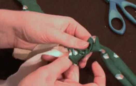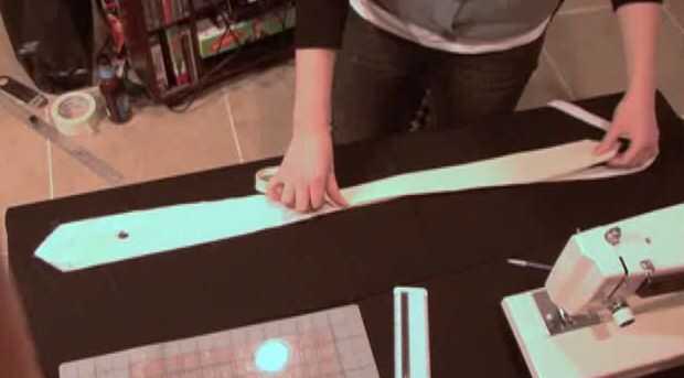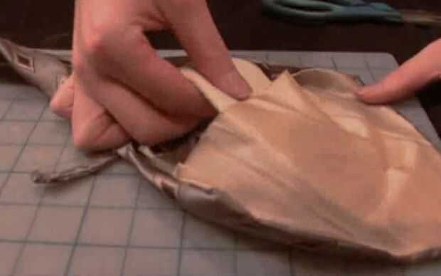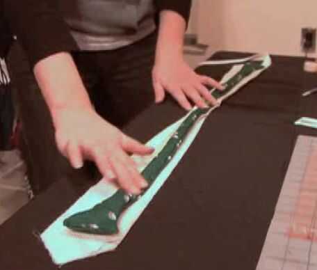 7. Coloque los revestimientos de interiores encima de la otra para que los extremos más grandes están enfrente uno del otro, aproximadamente sobre el tamaño de su pajarita. Simplemente les pin en el centro. Pone su corbata de moño en la parte superior, para comprobar la longitud y coser las dos piezas del interior mirando juntos. Corte las piezas extras (la parte delgada de los revestimientos de interiores).