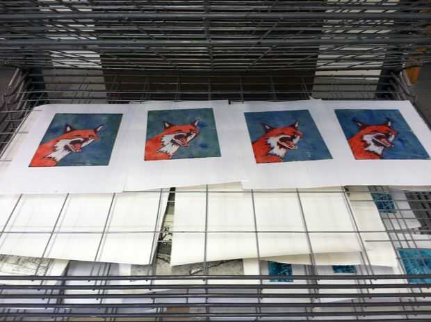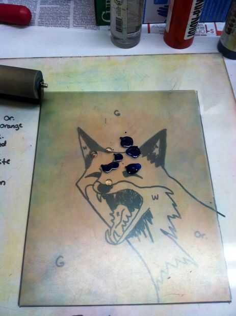 Lavar y desengrasar la placa y la tinta como las veces anteriores. Eliminar áreas blancas y colores que necesitan para seguir siendo el mismo dejando sólo lo que debe ser el nuevo color o combina con los colores anteriores, su matriz, o contorno será todas las capas de color en capas encima de la otra como puedes ver en mi fox. Imprimir como antes y listo! Deje que su seco de impresiones y luego editarlas en su imagen como tal: "Título" 1/4 (si usted acaba de hacer uno solo pones 1/1) de su nombre y el año se hizo.