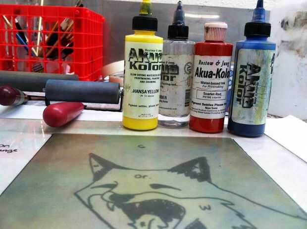 Zona de trabajo cubierta con periódicos viejos o una alfombra sucia. A su papel de calco sobre un espacio en blanco hoja de papel de periódico y sobre eso un pedazo claro grueso grande de plexiglás todo presionado. Set tintas y rebuznadores, guantes, toallas, alcohol, y Q-tips y colocar el papel que vas a imprimir en un lado por lo que permanece limpio. Lave su plato con jabón amanecer y desengrasar con Bon ami. Secar la placa y colóquela sobre la imagen en su área de trabajo. Puede mantener la placa en lugar usando el dedo para soltar un poco de agua debajo de la placa.