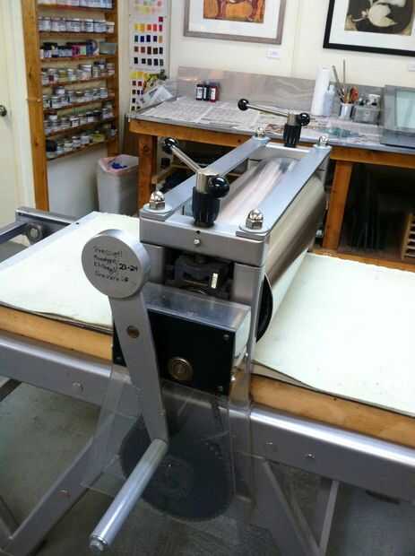 La prensa que estoy usando es hecha por Takach aquí en Albuquerque, la configuración puede diferir dependiendo de la prensa está utilizando. Para monotipos, la presión debe ser 23. Esto significa que el número 3 tiene que ser el número 2 en ambos lados de la prensa. Después de colocar el rodillo de presión a la prensa los fieltros de Levante y coloque su hoja de registro en la prensa.