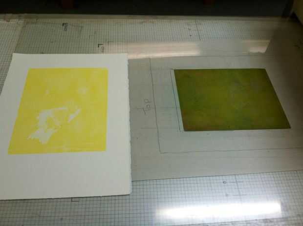 Tomar el plato y colocarlo lado de tinta hasta en su hoja de registro donde marcaste tu plato para ir. Luego tomar su papel y coloque el lado derecho (sus iniciales deben ser en la parte trasera) hacia abajo en la placa dentro del contorno de papel sobre la hoja de registro. Poner una hoja de papel de periódico sobre el papel y colocar los fieltros en la prensa tirando y suavizar cualquier arruga. Rodillo de la prensa a través de entonces cuidadosamente levante fieltros quitar papel y retire el papel de su plato. Dejar de lado su primera capa hasta su listo para imprimir el siguiente color. Usted puede hacer más amarillos (o cualquiera que sea su color más claro), pero si estás interesados en tener más de una impresión puede pasar al siguiente color.