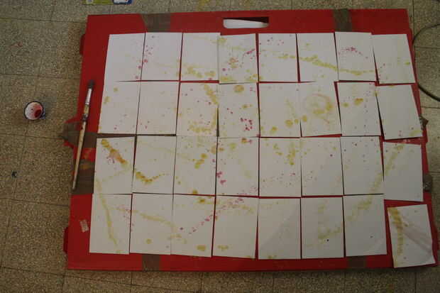 Organicé algunos colores en tacitas .you puede tomar colores más barato disolverlas en un poco de agua y empezar a salpicar en los sobres