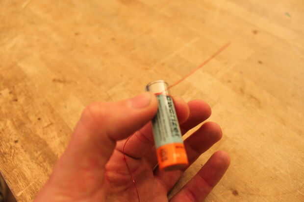 4. Deja una longitud de cable (dos pulgadas) que se arrastra de la bobina después de enrollar el alambre de cobre alrededor de la batería AA 15 veces.