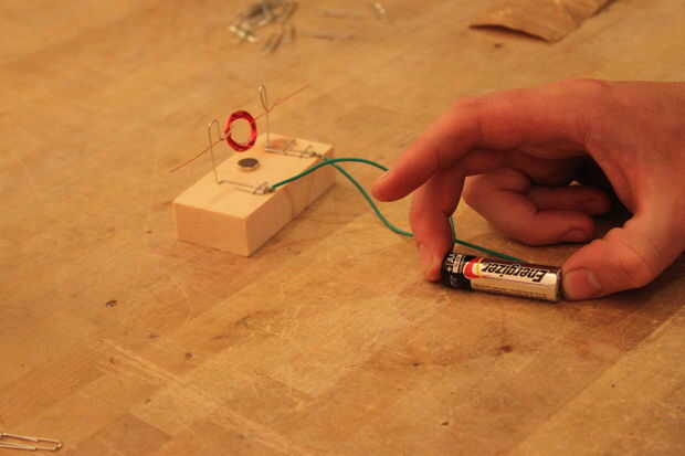 4. Si la bobina de cobre no sigue giro que tendrá que lijar los extremos de la bobina de cobre mejor, puede que necesite ajustar la bobina a ser más equilibrado, puede que necesite ajustar sus estantes de Clip de papel para colocar la bobina más cerca al imán, usted puede necesitar unir los extremos expuestos del cable aislado a la batería , puede que necesite etc.... Ajuste y prueba es la clave para crear un buen funcionamiento Motor.