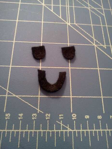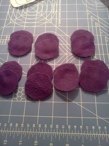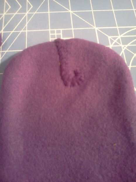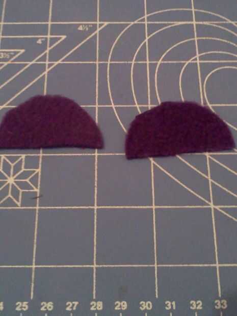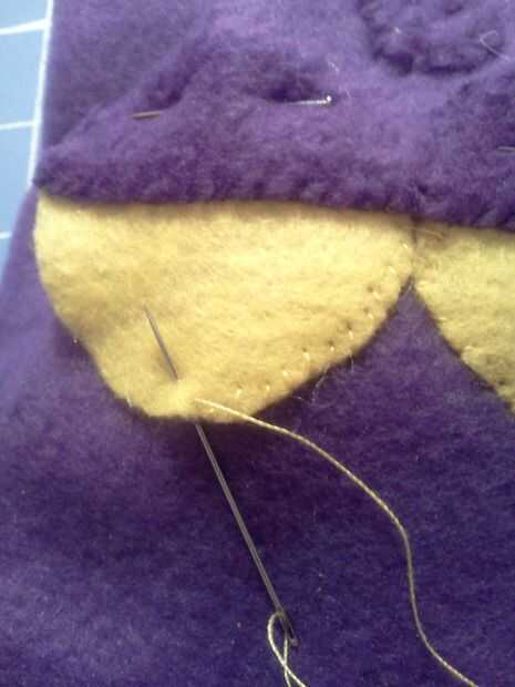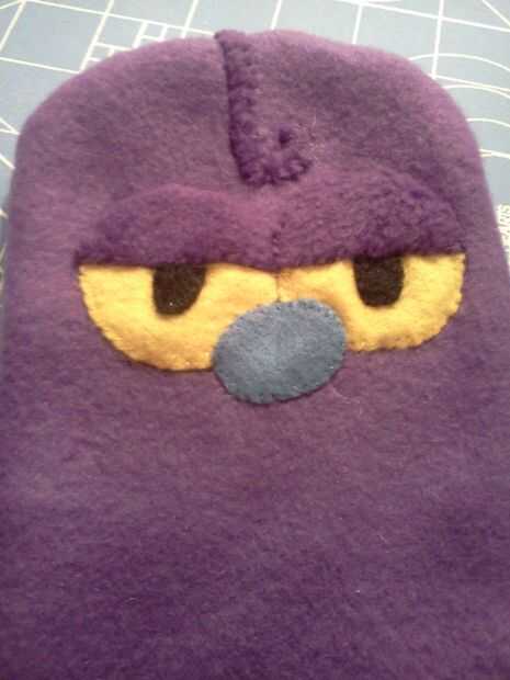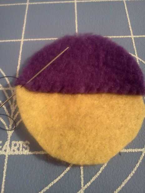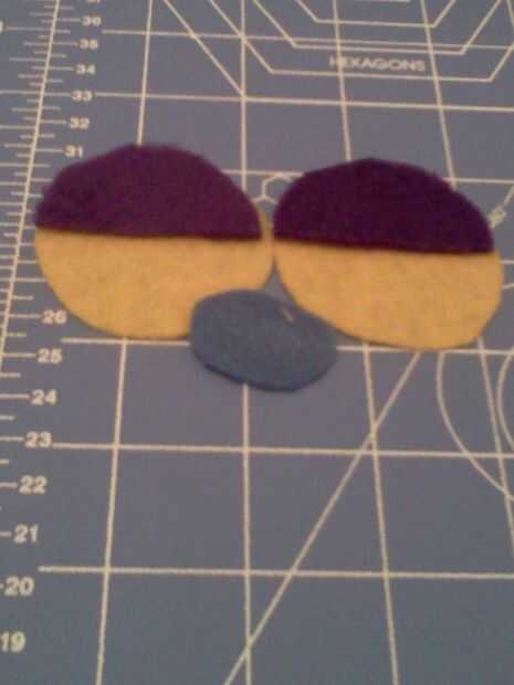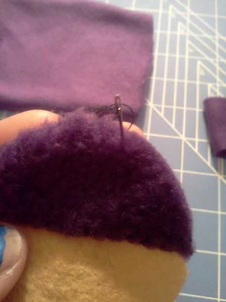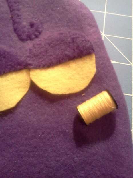 Que coser la cara antes de coser la parte de atrás, porque es más fácil. Coser las tapas del ojo morado oscuro a los ojos de amarillo todo el camino alrededor. Cortar y coser la más adorable Q rizada en medio de la frente. También cortar muchos ojo tamaño ojeras púrpura para coser en los brazos.