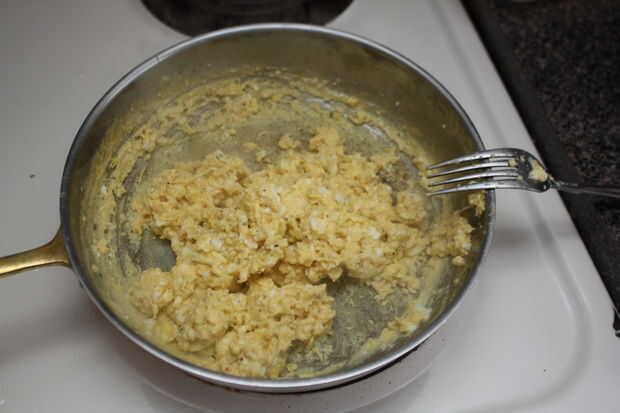 Vierta la mezcla de huevo en la misma sartén que el tocino se hizo en y cocine a fuego medio. Revolver de vez en cuando como si se hacer huevos revueltos.