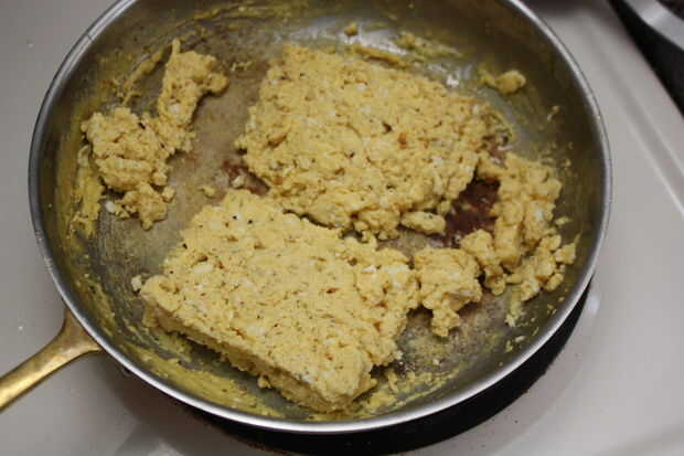 Una vez que el líquido se cocina pero los huevos son todavía pegajosos, introduzca los huevos en una patty con una espátula. Tapa hasta que esté completamente cocido en ambos lados. Utilizando la espátula cortar la empanada de huevo en 2 partes y cortar al tamaño deseado que cabe en el muffin.
