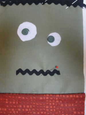 Para la boca cosidas en un trozo de rick-rack negro. Para la rayita, cosió una fila de rick-rack negro en la costura donde la cara con el pelo.