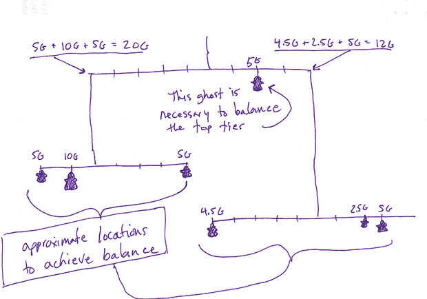 Comience con los niveles inferiores como usted tendrá que considerar el peso total de cada nivel al equilibrio de los niveles que se colocan para arriba. Una vez que haya definido la agrupaciones y colocación aproximada averiguar donde quieras el fulcro en el nivel por encima de él y añadir a cualquier fantasmas adicionales que pueden ser necesario para equilibrar este nivel.