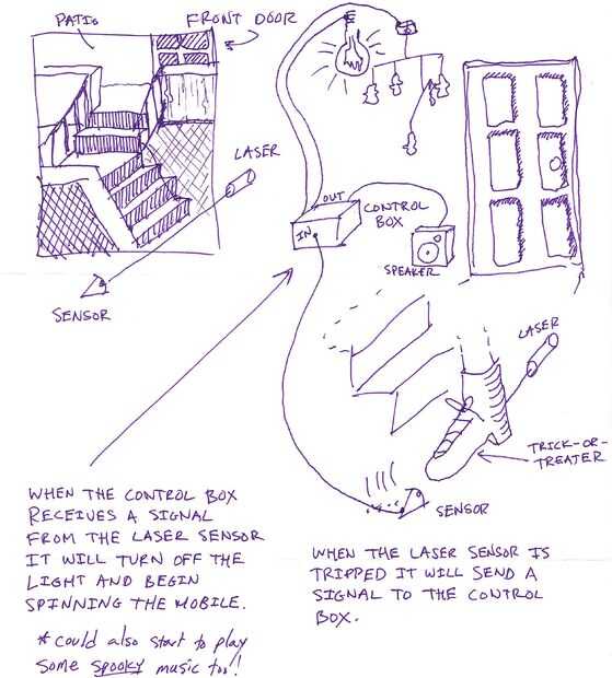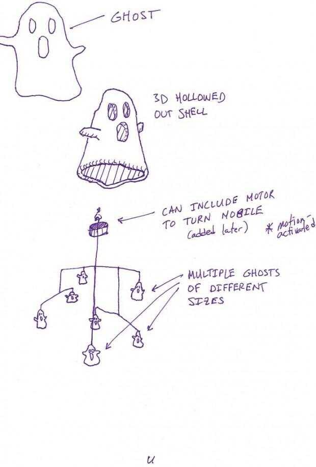 La escala original de este concepto era diseño apenas un fantasma brilla en la oscuridad. Mi mente demasiado cafeína tomó esta idea y corrió con ella. "¿Por qué detenerse allí?" dijo, "muchos fantasmas lindos son mejores que uno! ¿Y por qué no hacerlos volar? Así que la idea de crear un móvil para hacer los brillantes fantasmas volar llegó a ser; que condujo a la idea de motorizar el móvil; que condujo a la idea de utilizar un circuito de detección de rotura de viga para arrancar el motor; que condujo a la la idea de utilizar una luz para "cargar" el efecto de resplandor que se apagan cuando el rayo estaba roto; que condujo a la idea de añadir una banda sonora espeluznante que sería empezar a jugar cuando esto sucedió. ¿Y quién soy yo para ignorar a mí mismo?