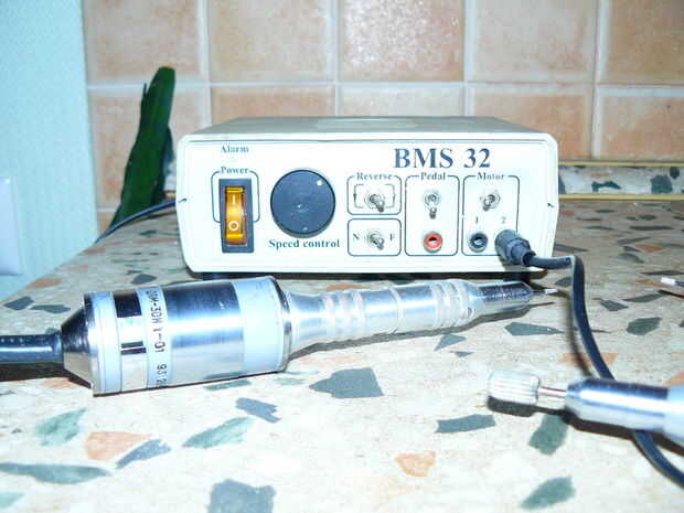 Las herramientas que utilizo son muy simples. Para cortar el material a medida yo uso una sierra regular y un tornillo de banco pequeño montado en un taburete. Para formar áspero utilizar una lijadora de disco de mesa (la puede ver en el siguiente paso) y para la talla real utilizo un taladro dental 32 BMS con una amplia variedad de brocas. Los toques requiere herramientas de mano. Utilizar cuchillos de talla de madera.