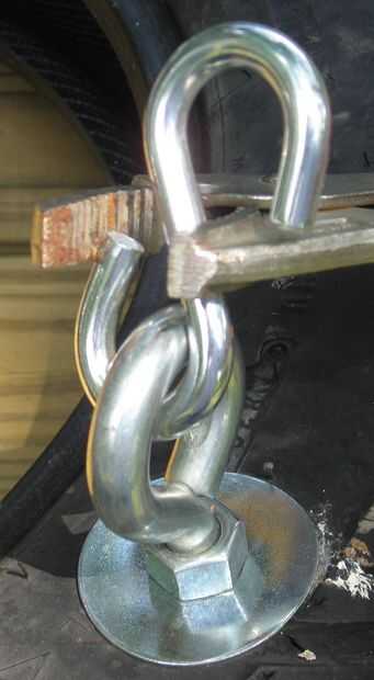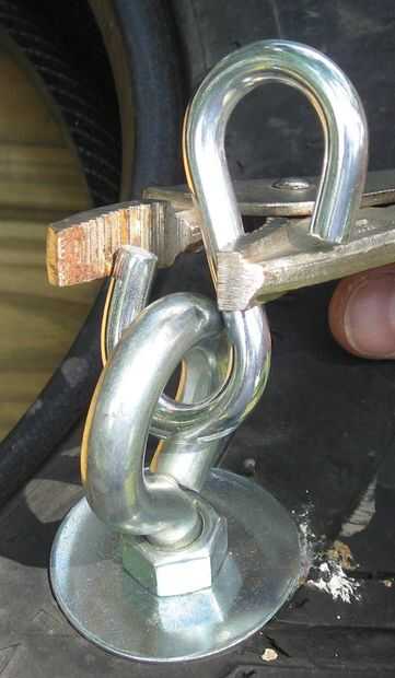 Con un gran Vice Grip marca pinzas, apriete lateral sujeta del gancho en s para que finalmente se cerró alrededor del perno de ojo. Esto lleva a exprimir varios de los apretones de Vice para que esto ocurra. Ajuste el Vice apretones bastante amplia y apriete, cierre gancho s un poco. Abrir las garras del vicio y apriete el perno de ajuste, lo que los hace un poco más pequeño y apretarlas firmemente una vez más, cerrar el gancho en s un poco más. Repita este proceso, haciendo que el Vice apretones más pequeños cada vez, hasta que el gancho en s se cierre completamente alrededor del perno de ojo. Recuerde que este proceso, porque tendrás que hacerlo en todos los accesorios de gancho en s.