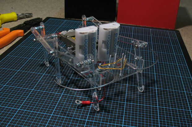 - Añadir los zapatos a los pies de tu robot (los pies acrílico redondeados no agarre superficies bien). Apliqué una gota de pegamento caliente en el borde inferior de cada pata y rendimiento fue mejorado grandemente. (Pero si tienes acceso a seis miniatura tamaño zapatillas que sería una opción mucho mejor)