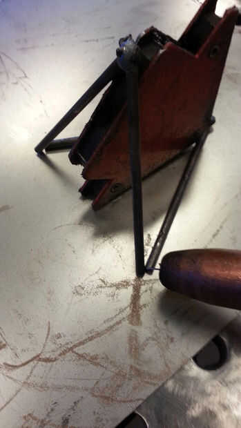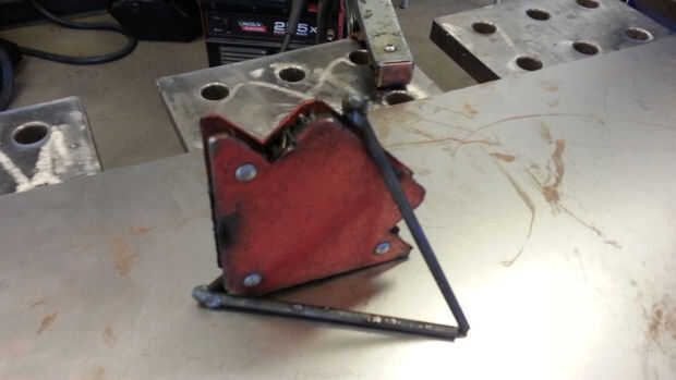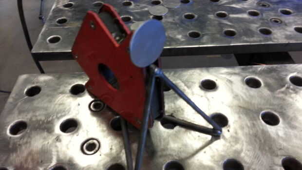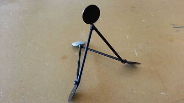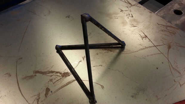 La parte inferior de cada una de las piezas de soldadura juntos que hacen un ángulo de 75 grados. Con esto, no importa de qué lado está en el suelo, el punto en la parte superior está siempre directamente sobre el centro.