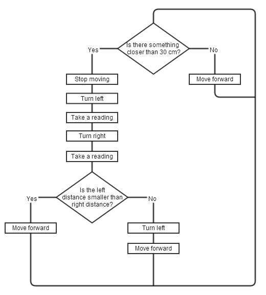 Si no hay nada dentro de los 30 cm que el robot puede simplemente mueva hacia adelante el camino es claro. Si hay algo menos de 30 cm el robot debe realizar maniobras de evitación del obstáculo.