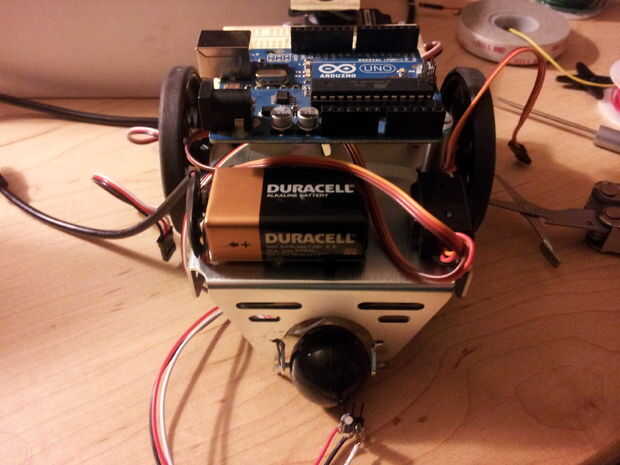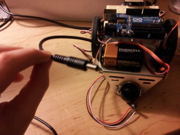 Bien, tiempo para conectar la pila que alimenta la lógica para la electrónica. Tomar poco de cinta adhesiva, o lo que quieras utilizar para fijarlo. La cinta del lazo y conecte la batería. Tome el adaptador de conector de barril de 9 voltios cosita y meterlo en la batería. Estamos listos. * Haga clic en grapas botón * "eso fue fácil!".