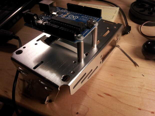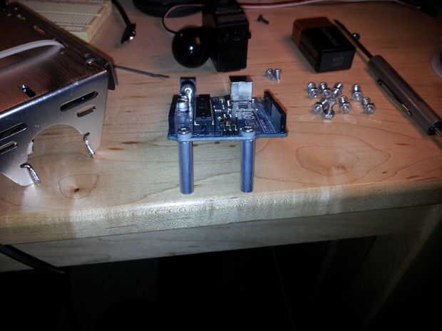 Una vez que los separadores firmemente agarrados a tu Arduino, alinee la parte inferior con la parte inferior de la regleta de montaje posterior (um... basta con mirar la imagen). Fije en su lugar, luego alinee el enfrentamiento frontal con la siguiente tira de montaje y tornillo en su lugar. YIPPEE, ¡ listo!