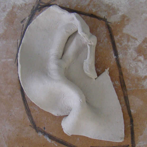 Como se puede ver en las fotos soy va alrededor de la oreja y curvando la masa dentro. Hacerlo en el patrón puedes ver cuanta pasta se necesita para construir el oído como ella consigue más pequeña que el patrón original.