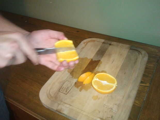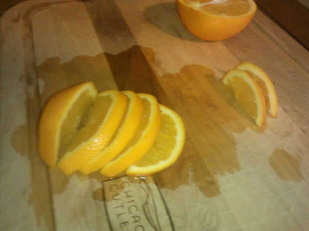 Hacia la mitad naranja con el corte y pulpa parte abajo para el lado de la pulpa queda plano contra el tablero de corte y la corteza redonda quede hacia arriba. Cortar la naranja en gajos por cortar horizontalmente (en relación con el corte inicial e interior). Cuña debe ser aproximadamente un cuarto pulgada de espesor.