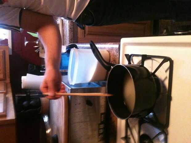 Deje que un pote de salsa (o una olla de tamaño equivalente o más grande) se calienta en la estufa.