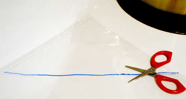 En primer lugar, tomar una bolsa de plástico limpia y corte un extremo de la bolsa por lo que se convierte en un triángulo. Las medidas para la mina son aproximadamente 7 X 10 pulgadas X 7 pulgadas. También es ideal utilizar un saco vacío, pero es más fácil ver lo que está haciendo con una bolsa de plástico transparente o bolsa de Ziploc.