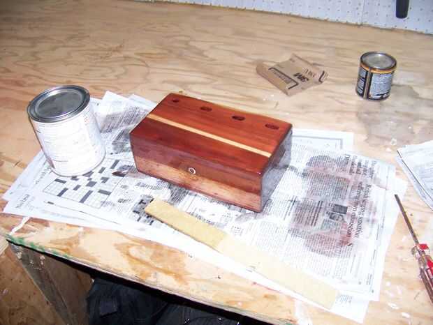 Lijado a lo largo de la veta de la madera, comience con una lija áspera, moviéndose lentamente hacia el papel de grano más fino y más fino hasta el exterior de la caja es absolutamente suave.