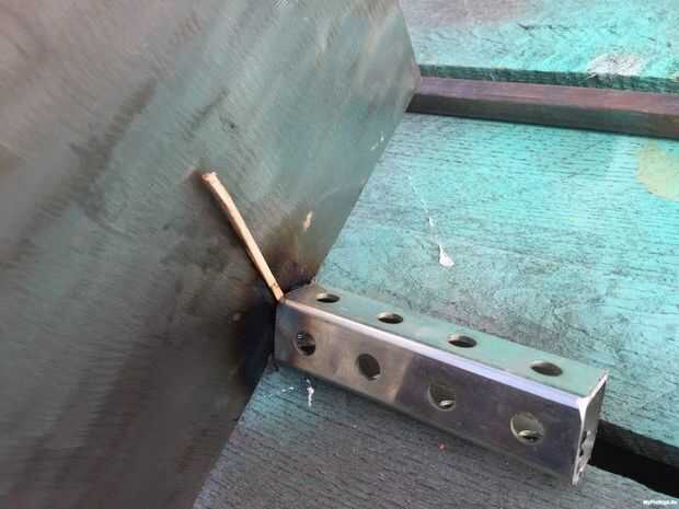 A continuación, muescas en el tubo entre golpes (hoyos) de 4 pulgadas hacia abajo y corte las placa 10-pulgadas largo. En ambos, derribó el cualquier borde filoso lo mejor que pude con la rueda de corte. También usé el molinillo a 'etch' una textura en el acero. No es necesario. Yo sólo estaba jugando. Después de eso, usé mi soplete Bernzomatic soldar la placa al tubo.