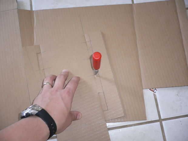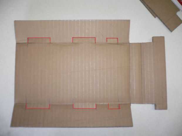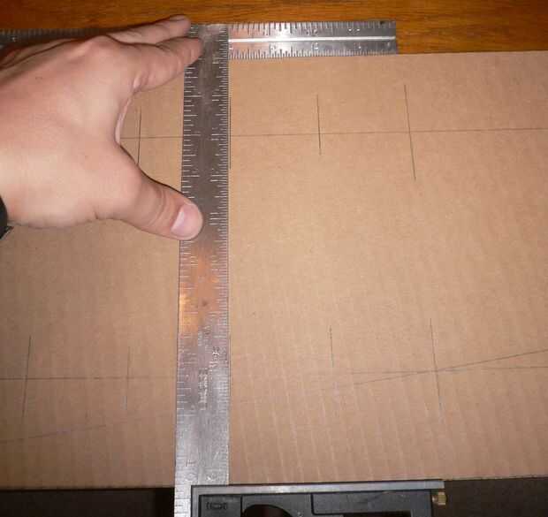 4. Alinee el estante segundo nivel a lo largo de la línea de referencia de ángulo recto que usted dibujó en un paso anterior y marque donde las fichas que tienen agujeros del corte para ellos. Usé un cuchillo del exacto para meter pequeños agujeros a cada lado de las pestañas.