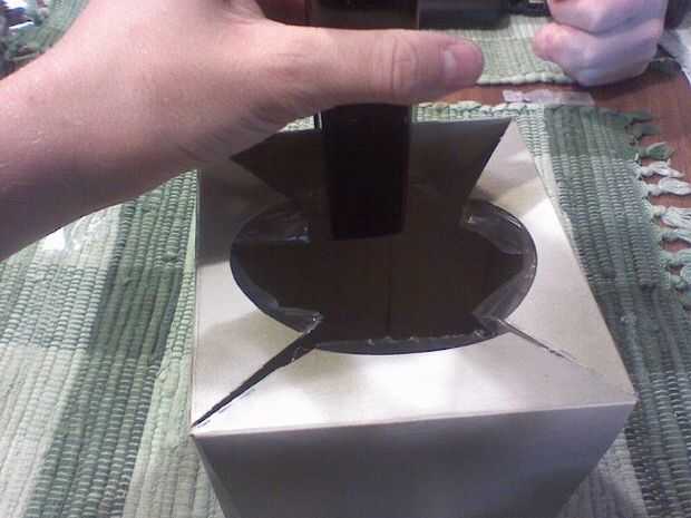 Grapa derecho después del corte para mantener unida a la caja del tejido y por razones de durabilidad. Sólo grapas como se muestra con una grapadora de oficina estándar en el interior o el exterior lo que crees que se ve mejor. Todavía se mantienen hasta el mismo.