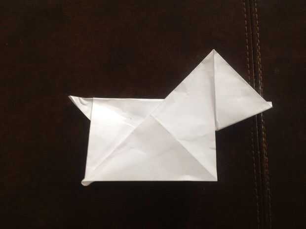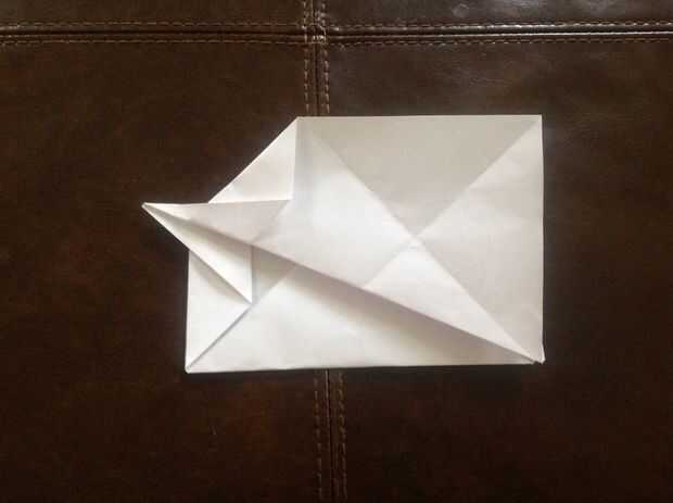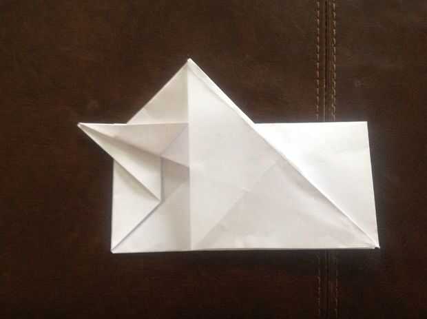 Unfold bottom corner flap. Pliegue diagnol. Luego, doblar la esquina trasera. Dé vuelta. Despliegue la aleta de la esquina. Doble diagnol otra dirección. Pliegue posterior.