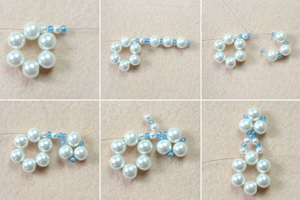 1 º, use el hilo de 60cm como el cable de trabajo, deslice una tira de perlas de 4mm y un grano de semilla en el cable, añadir una gota de perla 4mm y un grano de semilla otra vez y luego añadir cuatro rocallas y perlas perla 8mm tres alternativamente;