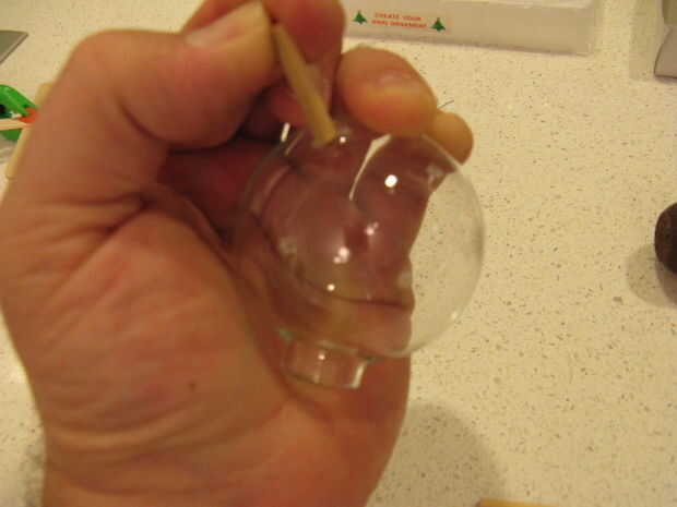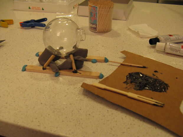 Usé de epoxy para pegar todo y crear un fuerte vínculo físico. Epoxi se presenta en dos partes: cuando usted Mezcle partes (normalmente iguales), una reacción química hace que la pasta se endurezca. Usé un poco de epoxy en la parte inferior de la pierna, unida al pie - apoyar todo con plastilina hasta la curación. Luego ajustaron la parte superior de las piernas y se reclinó la bola de cristal en las 4 patas, en los lugares rayados en el vidrio y se alejó.