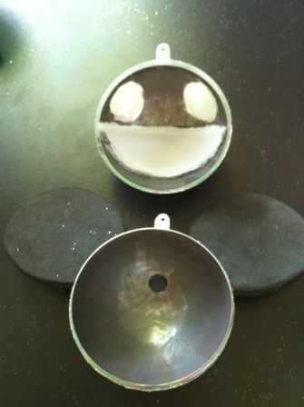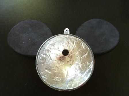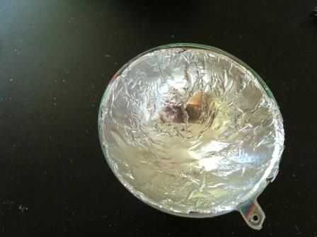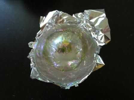 Cortar un cuadrado de papel de aluminio un par de pulgadas más grande que el ornamento y el interior de la mitad posterior de la ornamentación con el papel de la línea. Asegúrese de colocar el shinest lado para arriba, como esto actuará como un reflector de la bombilla. Alise el papel con los dedos hasta que quede apretado en el interior de la ornamentación y recortar los bordes. Recortar un pequeño círculo de papel con una cuchilla de afeitar para permitir que la bombilla de luz pase a través del orificio en la parte posterior de la cabeza. Asegurar el forro de papel en su lugar con un poquito de pegamento caliente.