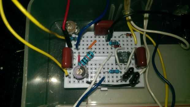 Para nuestro propósito, esta cámara viene en forma de un CI AD744. La señal de entrada corre en este pequeño amplificador operacional configurado como seguidor de tensión de ganancia unidad y listo, nada! De hecho, un amplificador operacional ideal permite cero corriente, pero en realidad los 1 millón ohmios de impedancia que ofrece cambiar la señal tan insignificante no podemos siquiera medirlo. Ver el esquema de cableado. También incluí una foto del circuito instalado en un protoboard, pero sobre todo tan usted puede sentir bien con vosotros mismos cuando tuyo parece más limpio. Tenga en cuenta cuando está poniendo lo juntos que las distancias más cortas posible son las más deseables.