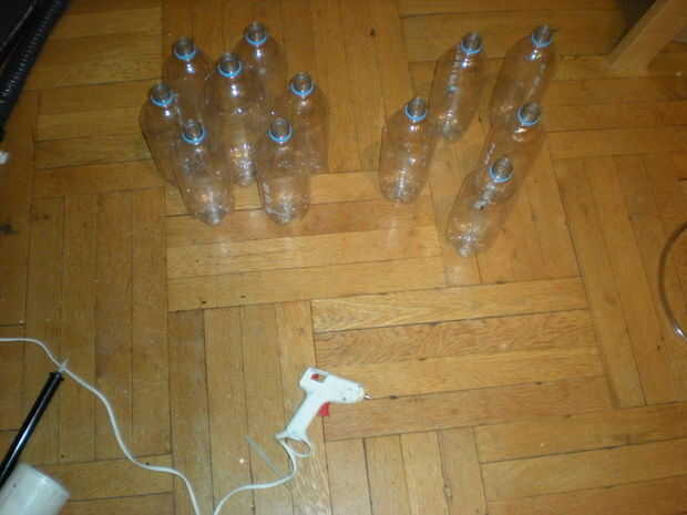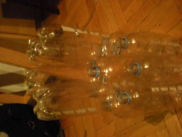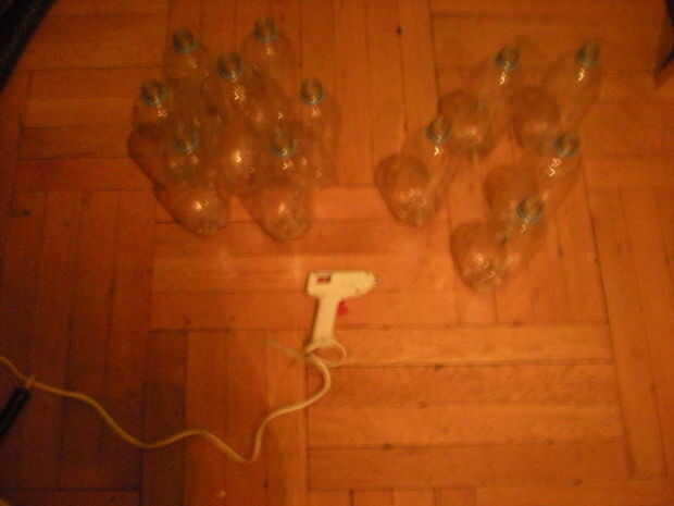 Pasos:-1. Retire la etiqueta de la botella. 2. Quite la parte inferior de la botella con la navaja. 3. Mida la distancia entre cada corte. (1 cm) 4. hacer cortes en la botella. 5. Retire el cuello con la navaja. 6. Corte la parte superior de otra bot