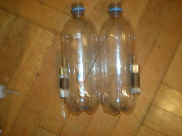 Para preparar la base que va a la línea de las botellas como en la segunda foto. Cuidadosamente añadir una cantidad uniforme de pegamento a la costura entre la botella y hacerlas rodar por lo que las partes que tiene pegamento en él se machaca entre las botellas. La línea de la botella en dos es como si en la primera foto debe tener un espacio incluso alrededor de cada conjunto. Más tarde agregué una botella extra de estabilidad, todo lo que tienes que hacer es deslizar las botellas sobre un poco. Si usted decide hacer esto debe asegurar que hay un montón de pegamento en la costura. Colocar alrededor de la botella de dos litros y los pares a la botella del pegamento.