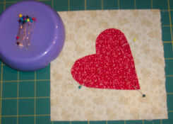 Coloque un corazón sobre un edredón cuadrados con la punta del corazón hacia la esquina inferior derecha de la plaza como se muestra en la foto. Centro el corazón y el pin en su lugar.