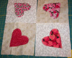 Hacer esto a todos tus corazones y plazas hasta tener cuatro como se muestra en la foto.  Línea el corazón de la manera que desea que aparezca en la parte superior de la colcha. (Todos los puntos de los corazones deben estar mirando las esquinas exteriores de la parte superior de tejido como se muestra en la foto.)