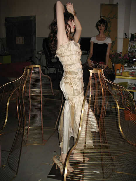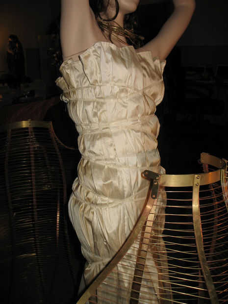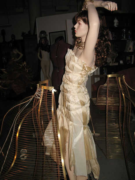 El forro del vestido es accesorio de la forma y la capa externa de la seda se cose a ella con la mano. Cintas de seda proporcionan el toque final y envuelven el vestido entero.