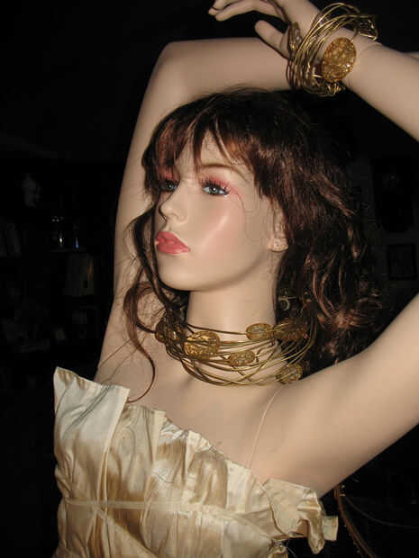 Quiso crear unas joyas para acentuar la pieza, pues de rastreado algunas piedras interesantes y jugaba con la flexión y el alambre para crear un collar y pulseras de anidación.