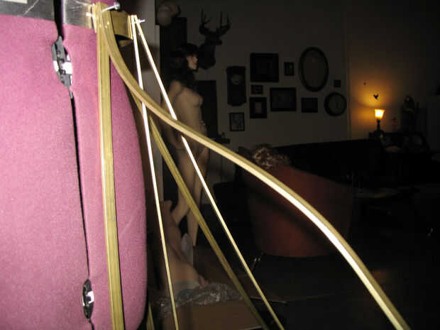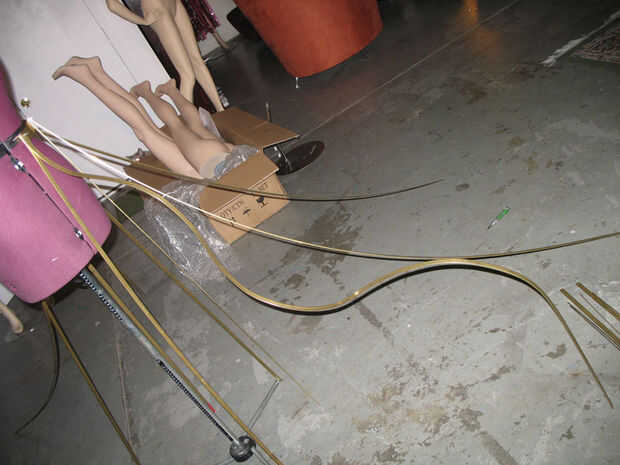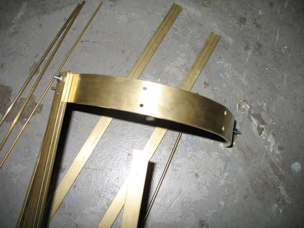 He trabajado en la medición y un prototipo de la correa y el esqueleto externo de flexión. El 1/2" latón la correa resultada para ser lo suficientemente maleable para doblar a mano con la ayuda de un tornillo de banco. Hurra! Estaba muy agradecido, porque tenía un montón de flexión en mi futuro. Quería que la circunferencia del círculo a ser 16', así que salió de la geometría a partir de ahí [2 * (pi) * radio = (pi) * diámetro]. El diseño transformado ligeramente y afectó los números, pero eso es por lo menos donde se inició.