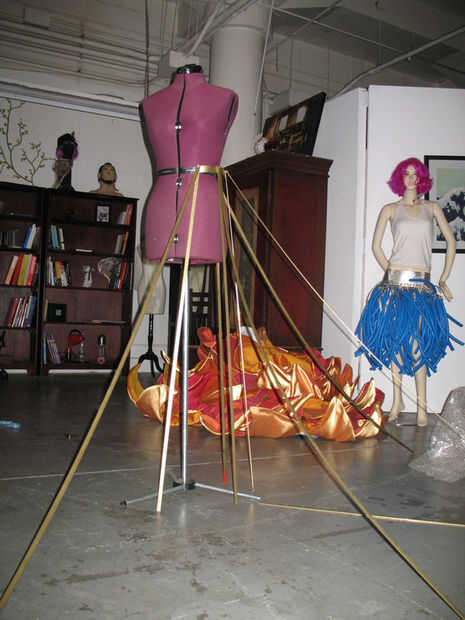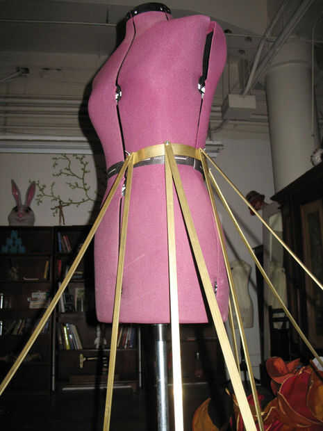Corte y doblado de la venda de la cintura para intentar tener una idea de cuántas líneas verticales la falda requeriría, luego perforar los agujeros para sujetar piezas que pude obtener una idea decente de como se vería.