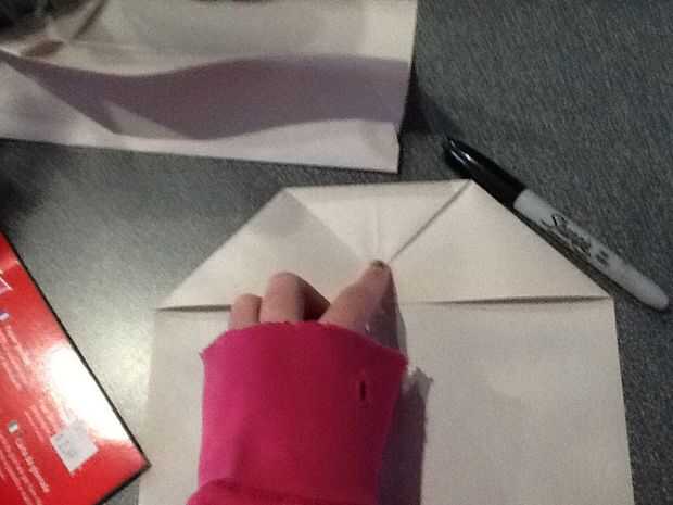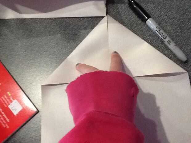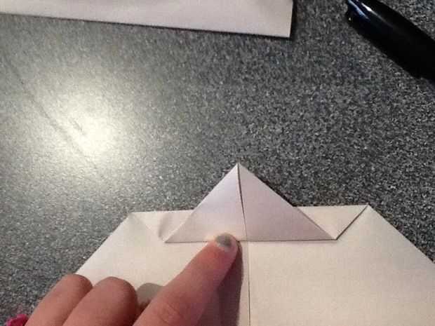 Ahora desplegar y dobla las dos esquinas superiores como se ve en la foto dos