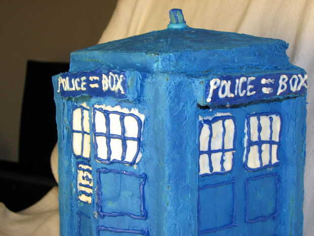 Tubo las ventanas en con glaseado de pegamento blanco. Hice este a mano alzada, pero si te sientes muy precisa puede hacer las ventanas como plazas en pergamino de papel y pegarán en el Tardis una vez se secan. Dibujar los paneles de bajorrelieve cuadrado en la Tardis a mano alzada con la guinda de la cola azul oscuro. Dividir los cristales de la ventana y escribe en el letrero frontal con el betún azul oscuro, demasiado. Extensión azul oscuro como el fondo de las señales de "Caja policial". Escriba "Caja policial" sobre los signos en color blanco. Pegue la Gomita en la parte superior.