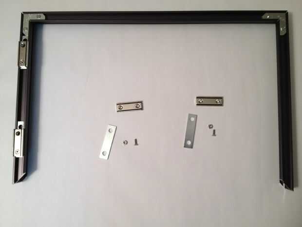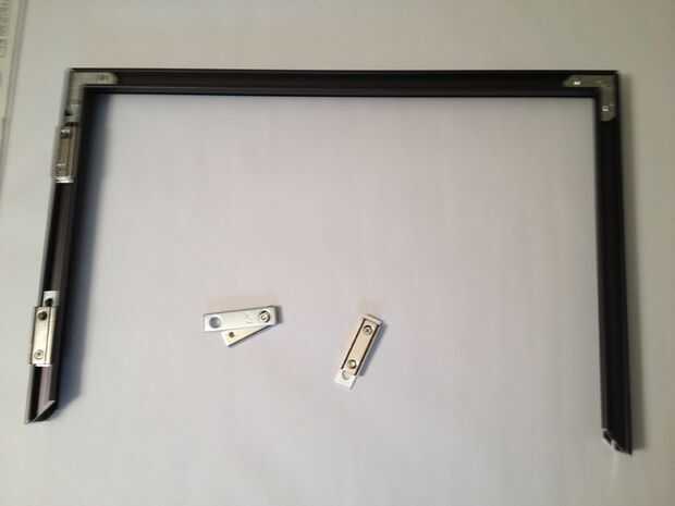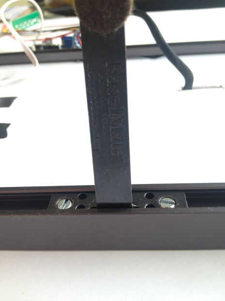 Si desea montar en el refrigerador, se recomienda conseguir cuatro imanes extremadamente fuertes. Utilizamos MMR-A-X8 neodimio imanes de montaje en K & J Magnetics para alrededor $5 cada uno. En retrospectiva, esto puede haber sido exagerada, pero la buena noticia es que no hay posibilidad que nuestro Panel de medios de comunicación va a salir accidentalmente el refrigerador. Para colocar los imanes en el bastidor, necesita una 2 "x 1/2" reparación soporte (vendido en Ace Hardware o similar) y cuatro 1/6" ancho x 1/2" largo máquina tuercas y tornillos.