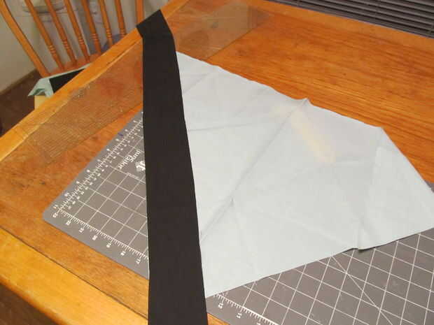 a continuación coloque la pieza triángulo de tela hacia fuera y coloque la tela de su acento sobre ella. Como en la foto, asegurándose de que tiene aproximadamente 3" de tela en la parte superior y dejando a la tela extra en la parte inferior, no corte ninguna de! DEJA A TODA LA TELA EXTRA EN! Alinee los bordes, se puede pin aquí si utilizas pins.